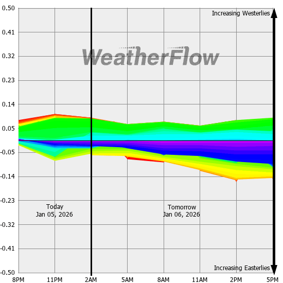 Computer forecast models generally can not resolve the topography of the Gorge and hence model predicted winds are often inaccurate. However, models can predict localized air pressure changes with a great deal of accuracy and it's these pressure differences (gradients) that drive the winds through the Gorge. The above "windbow" is a tool that our Meteorologists have developed to provide a powerful quick look of model predicted gradients.